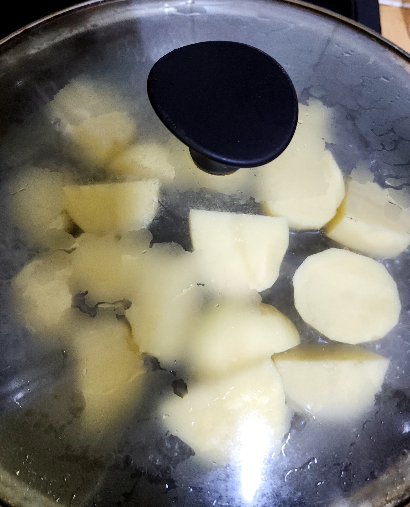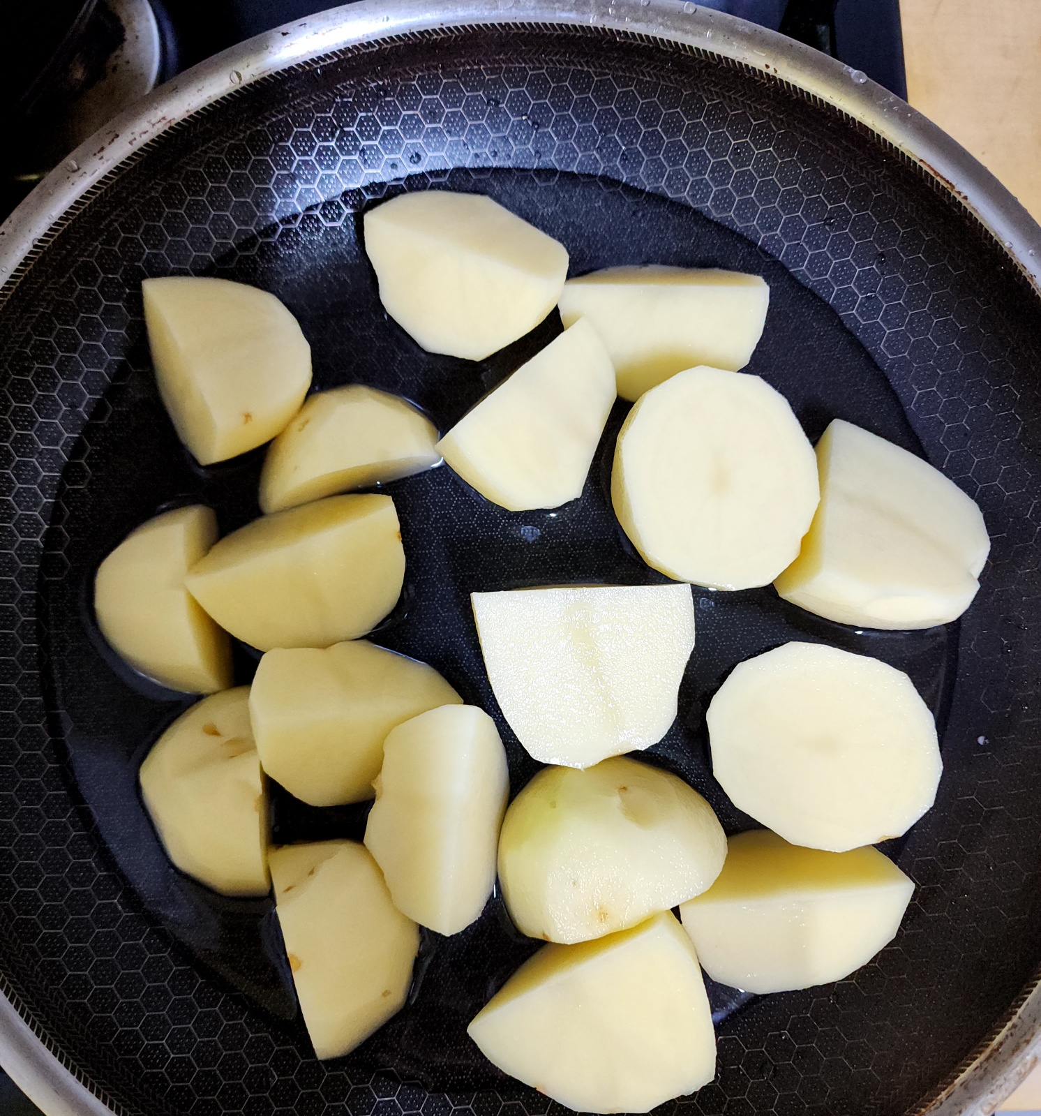 감자를 팬에 넣고 물을 250ml 정도 부어줍니다