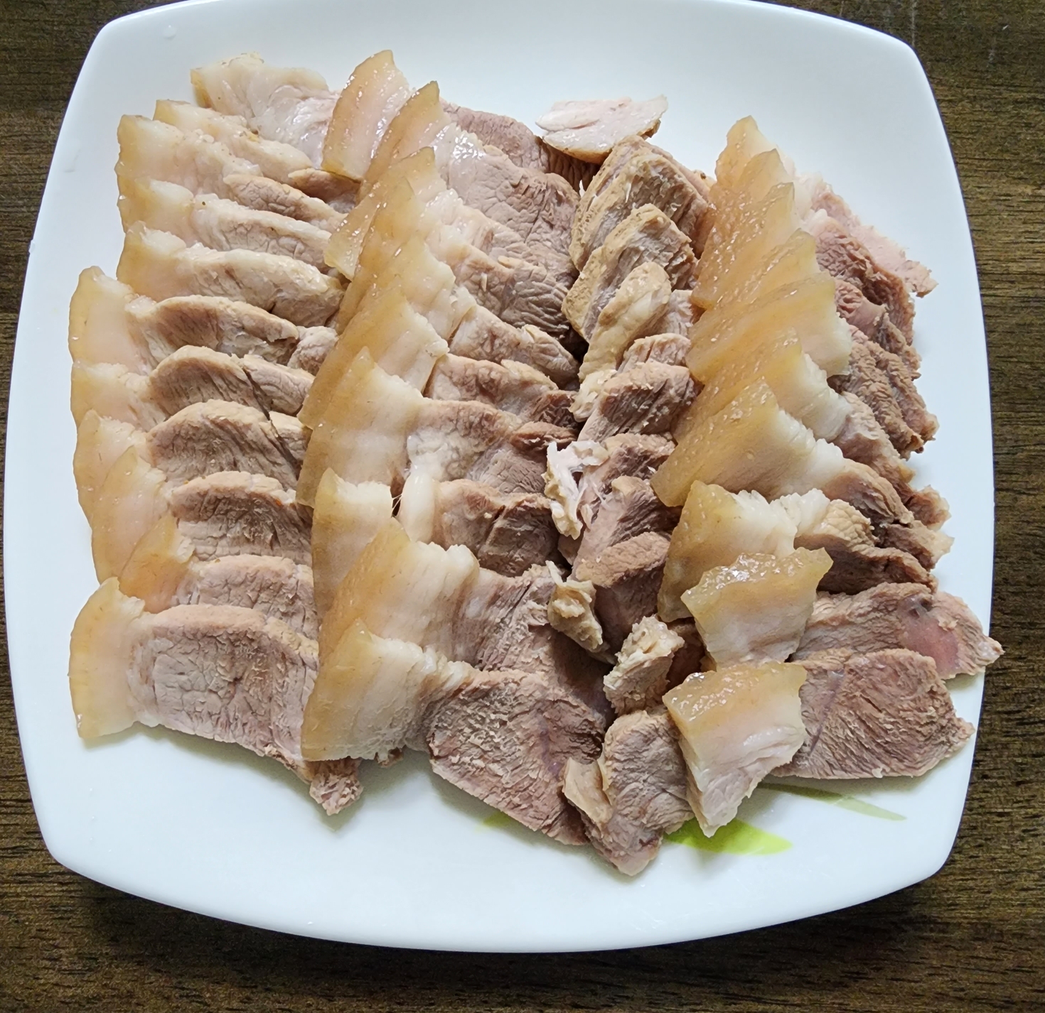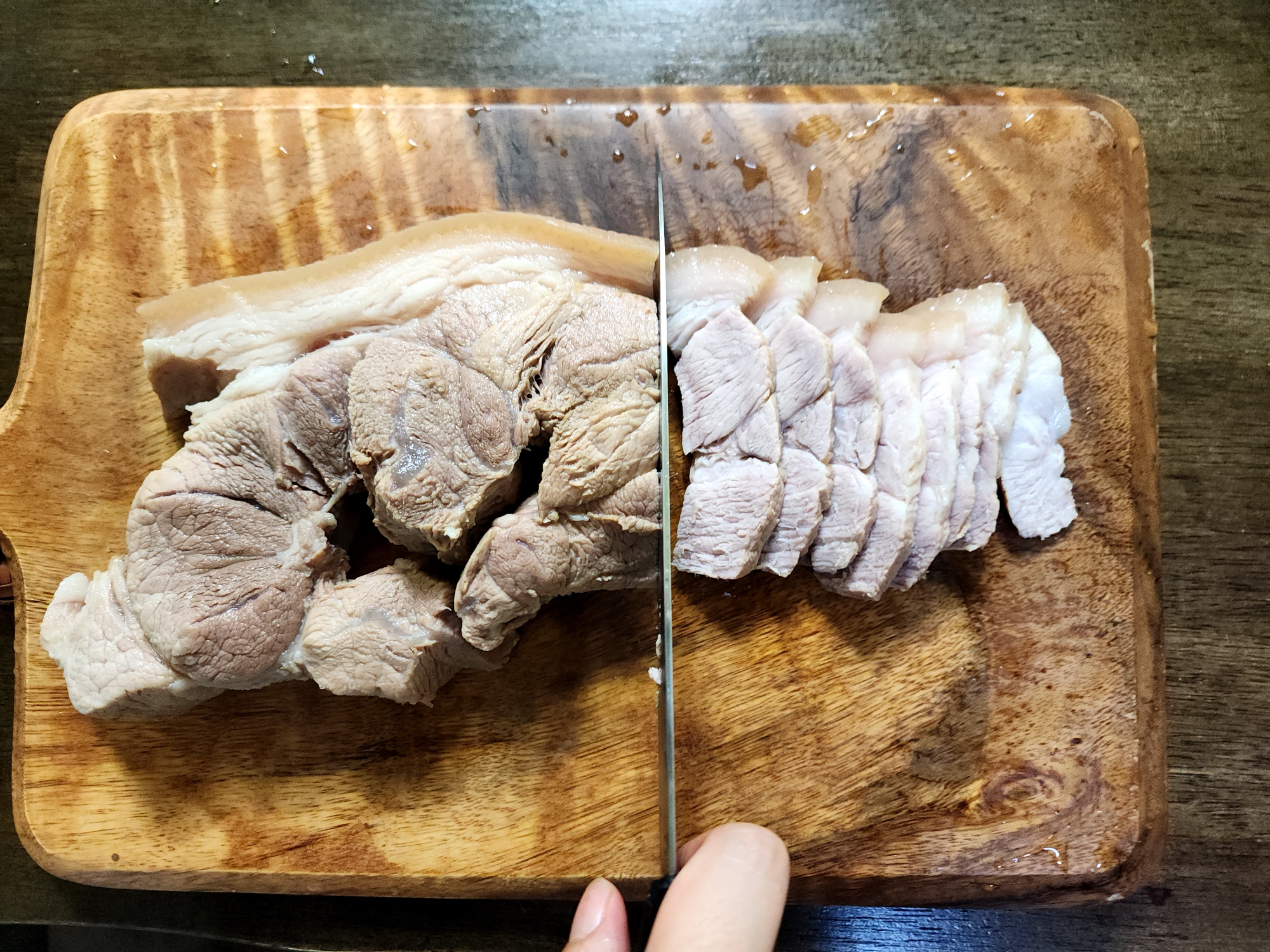 다 삶아진 고기는 찬물에 한번 헹궈주고 먹기 좋은