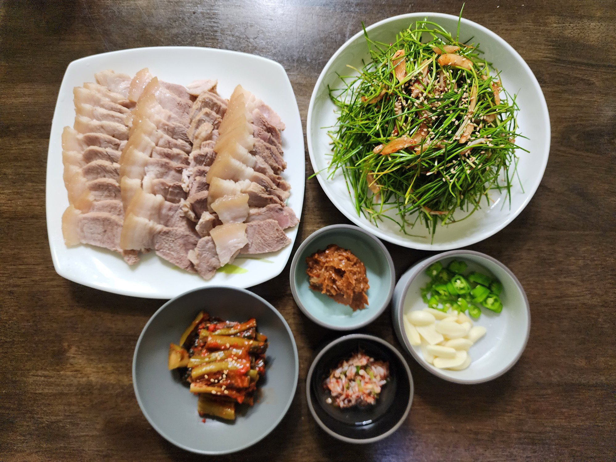 잘 삶아진 수육에 부추무침, 새우젓등 곁드림해서