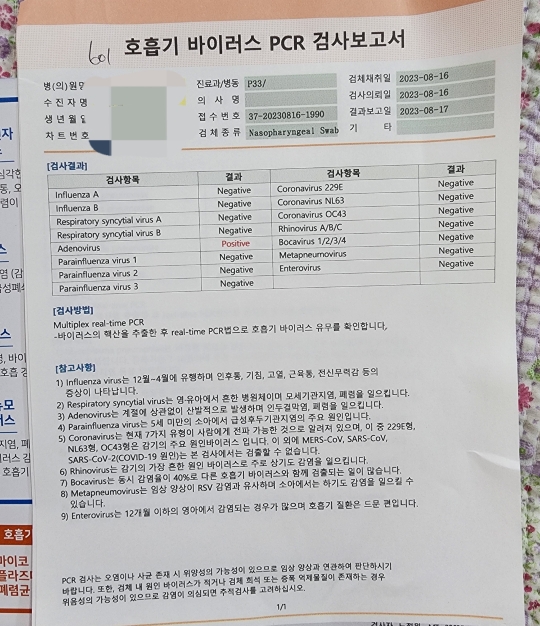 지속됐는데 바이러스 검사에서 아데노바이러스균이