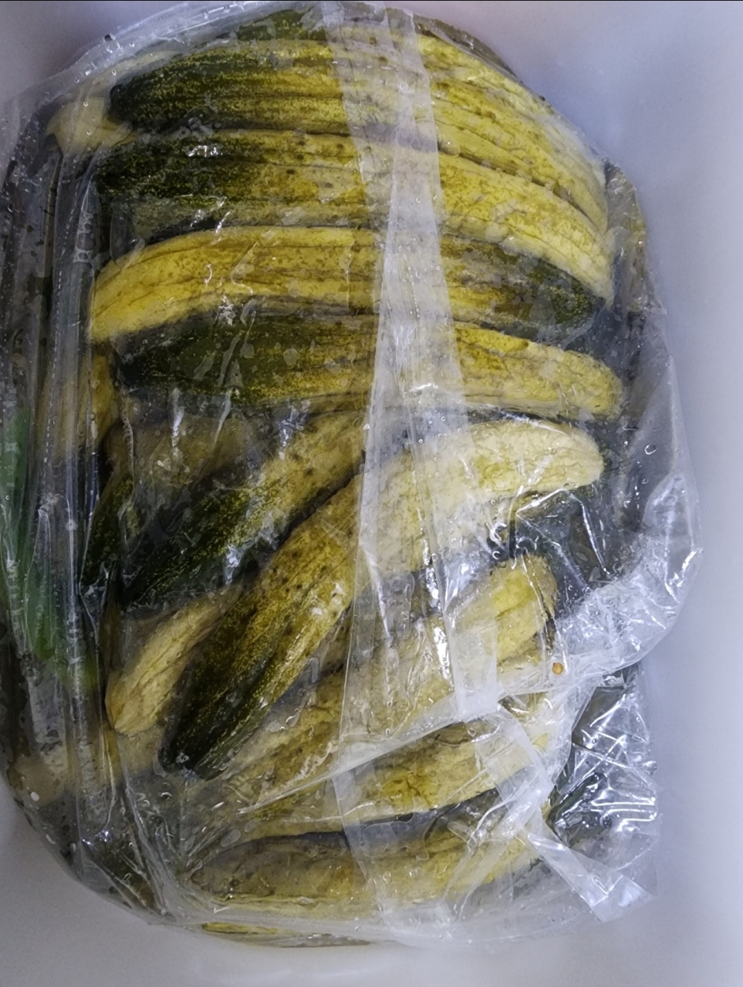 *김치통이나 김장봉투에 오이 겹겹이 쌓아주면서